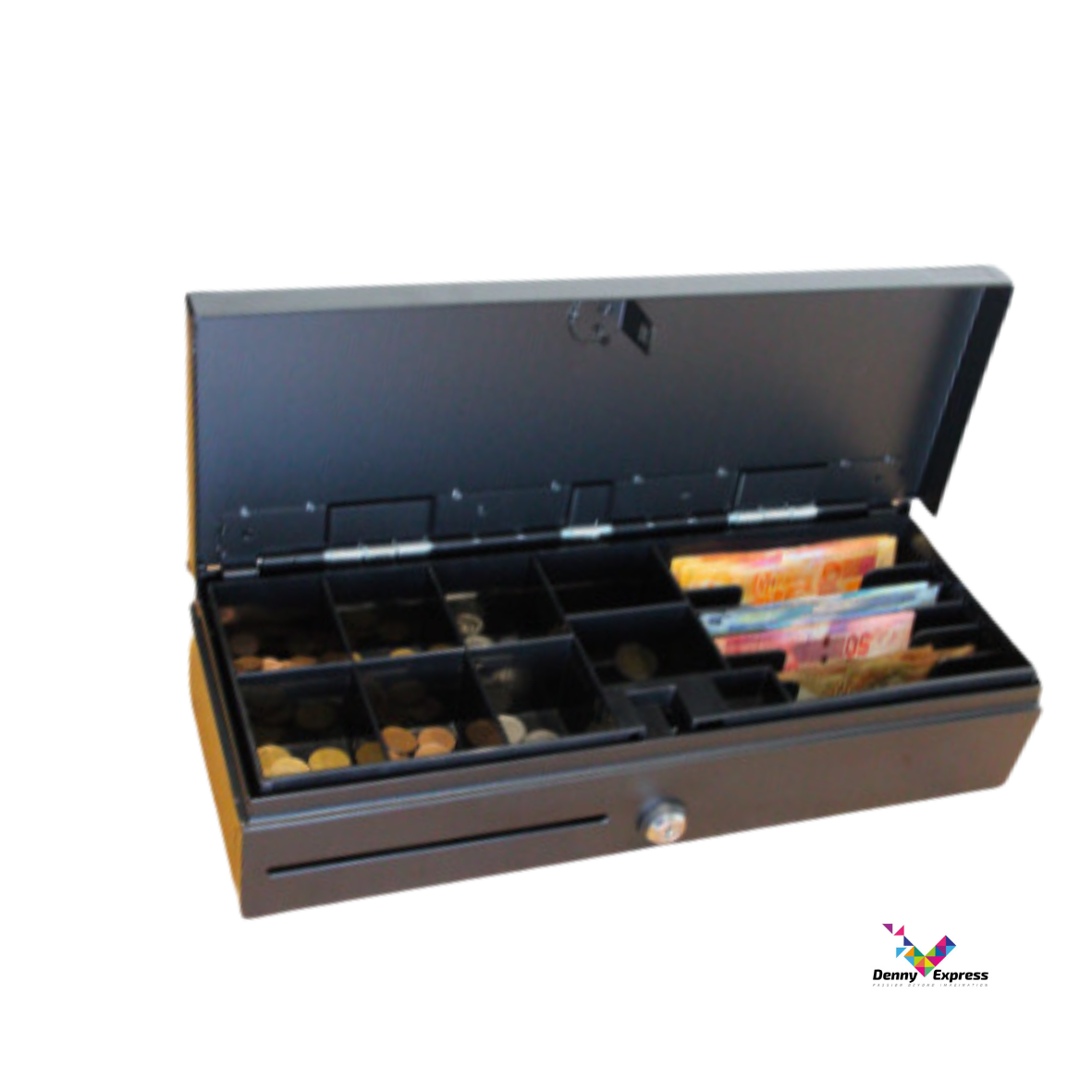 Black base with a stainless steel top. Cash drawer supplied complete with insert tray and lockable lid. Standard with RJ11 connector.